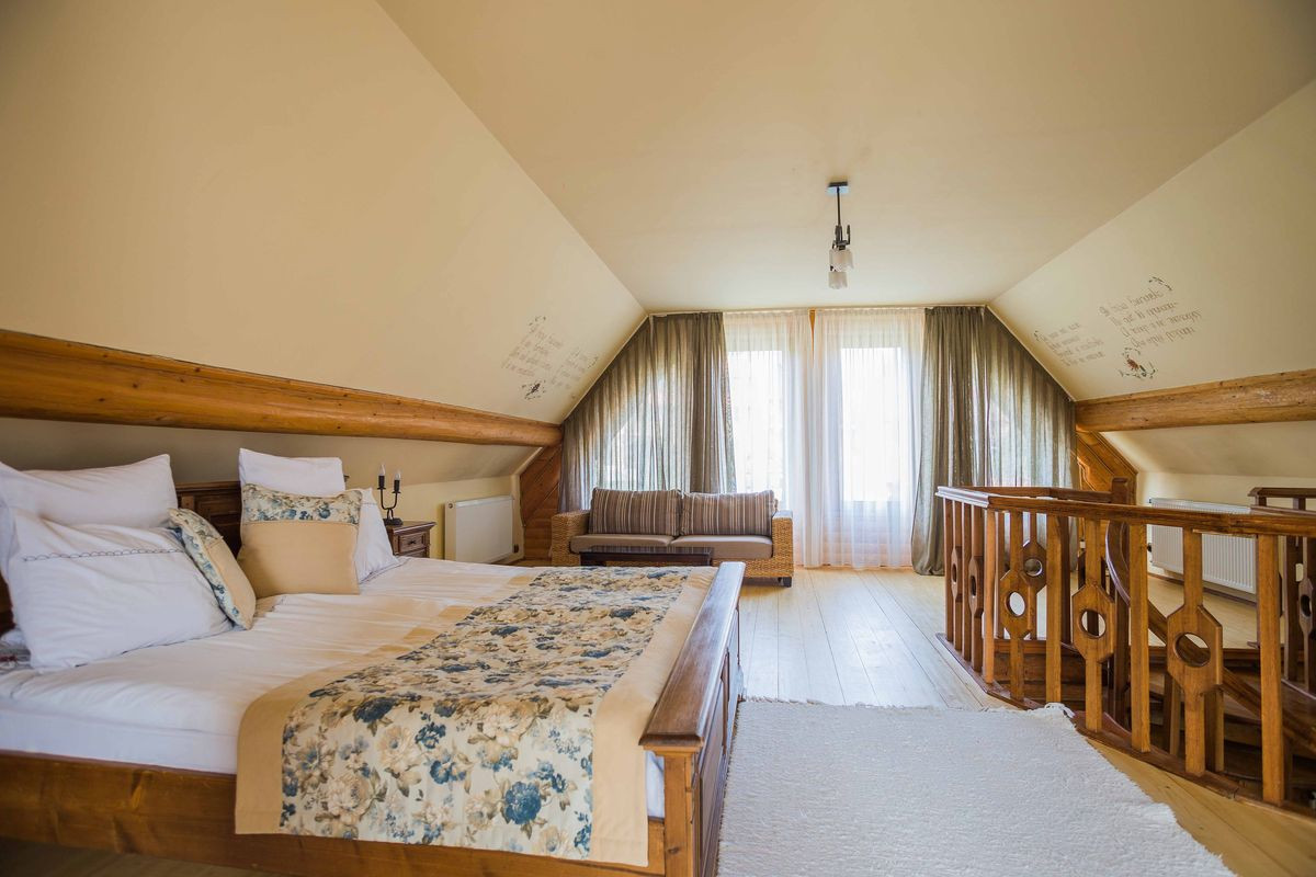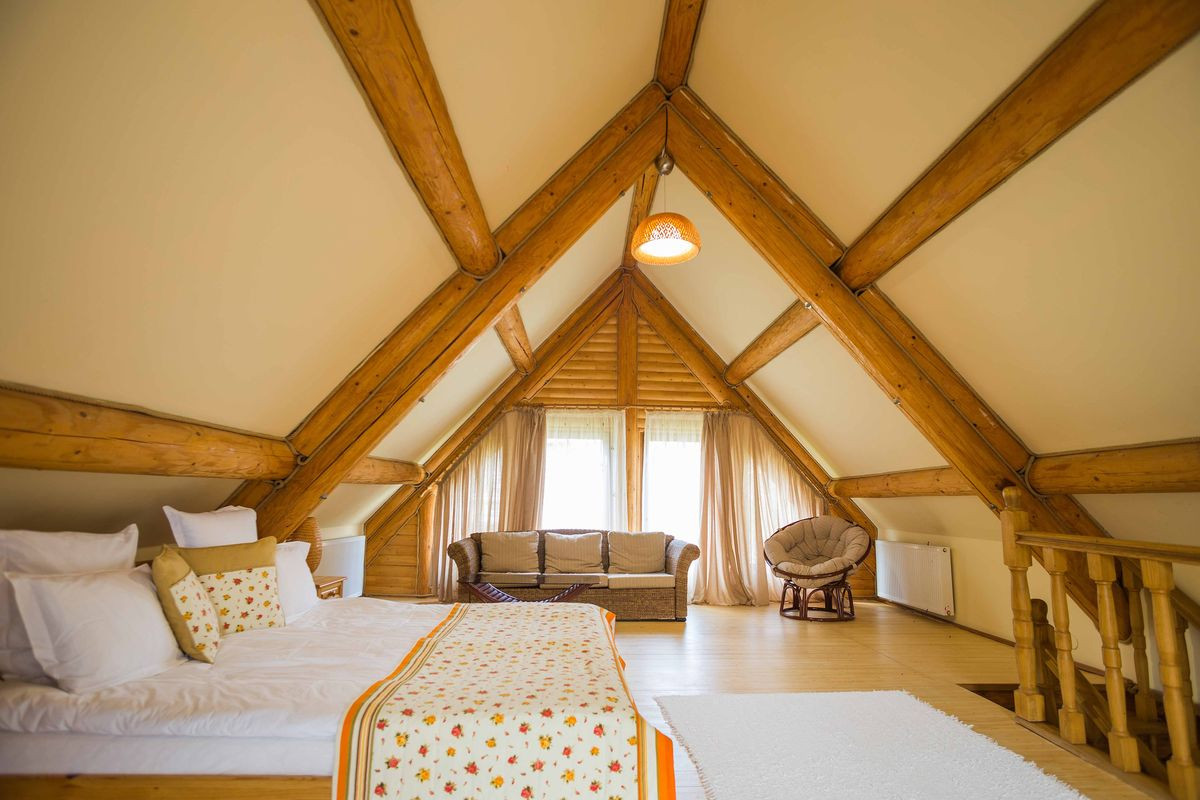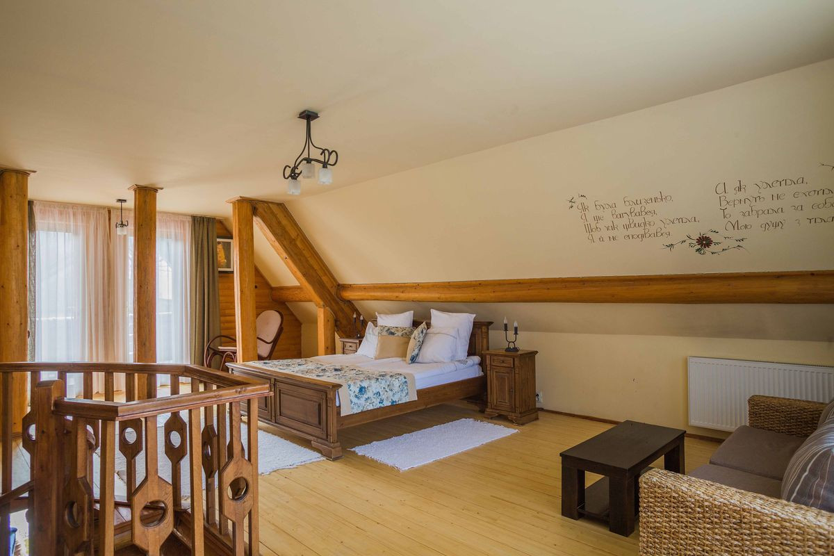 Created to make your vacation authentic and cozy. Natural wood, ornaments, dishes and furniture from Transcarpathian craftsmen immerse you in the spirit of the Carpathians and traditional culture. The special atmosphere is complemented by a terrace - a space for coffee, a book or quiet reflections among the mountain nature. Log cabins with a reed roof retain warmth and comfort in any season, giving a feeling of real detachment from the city bustle.